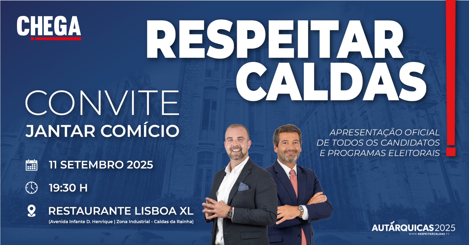 No passado dia 11, o partido Chega das Caldas da Rainha concretizou o jantar-comício de apresentação oficial da candidatura à Câmara Municipal, Assembleia Municipal e Juntas de Freguesia. Para além dos candidatos, o evento contou ainda com a participação do deputado Luís Paulo Fernandes e cerca 200 apoiantes.